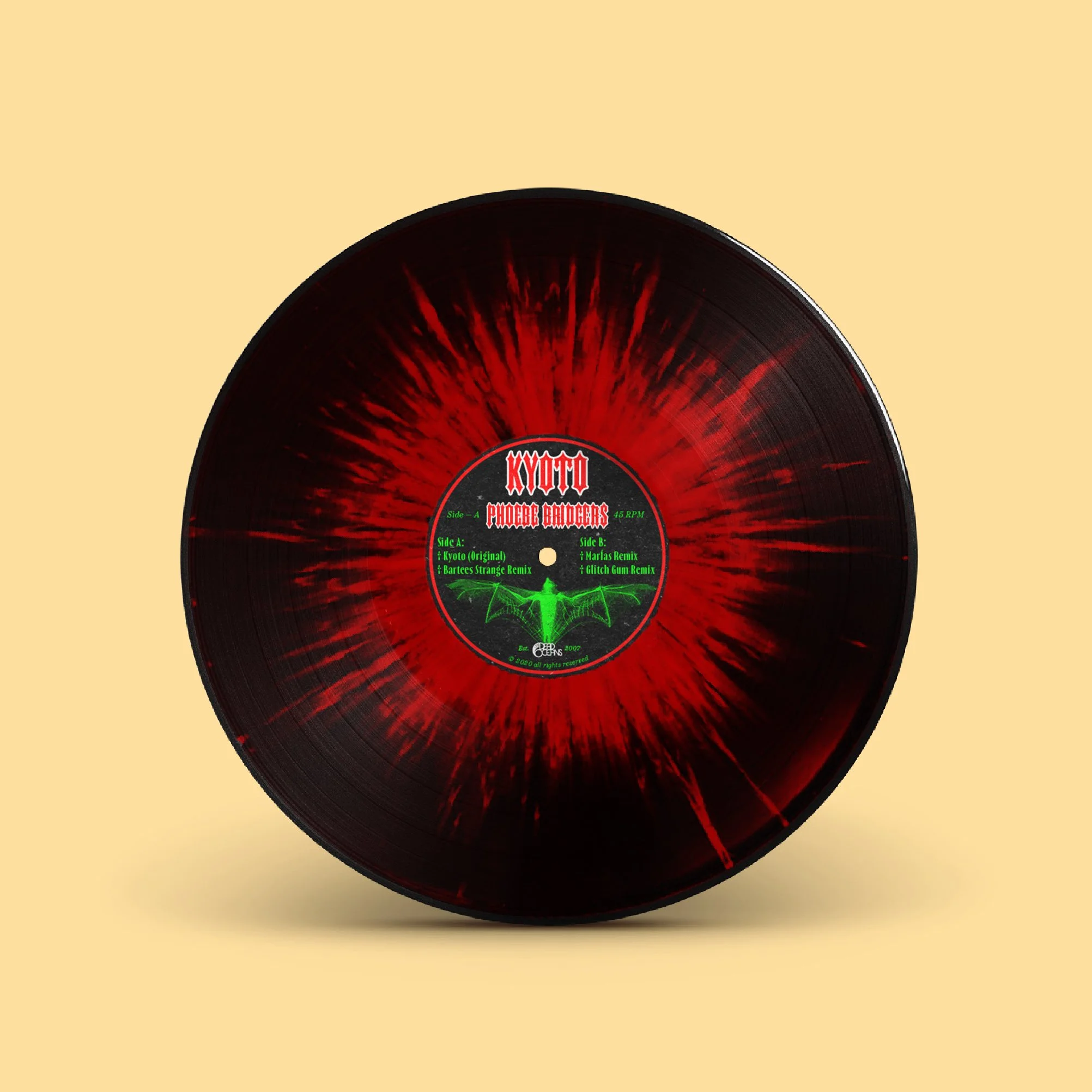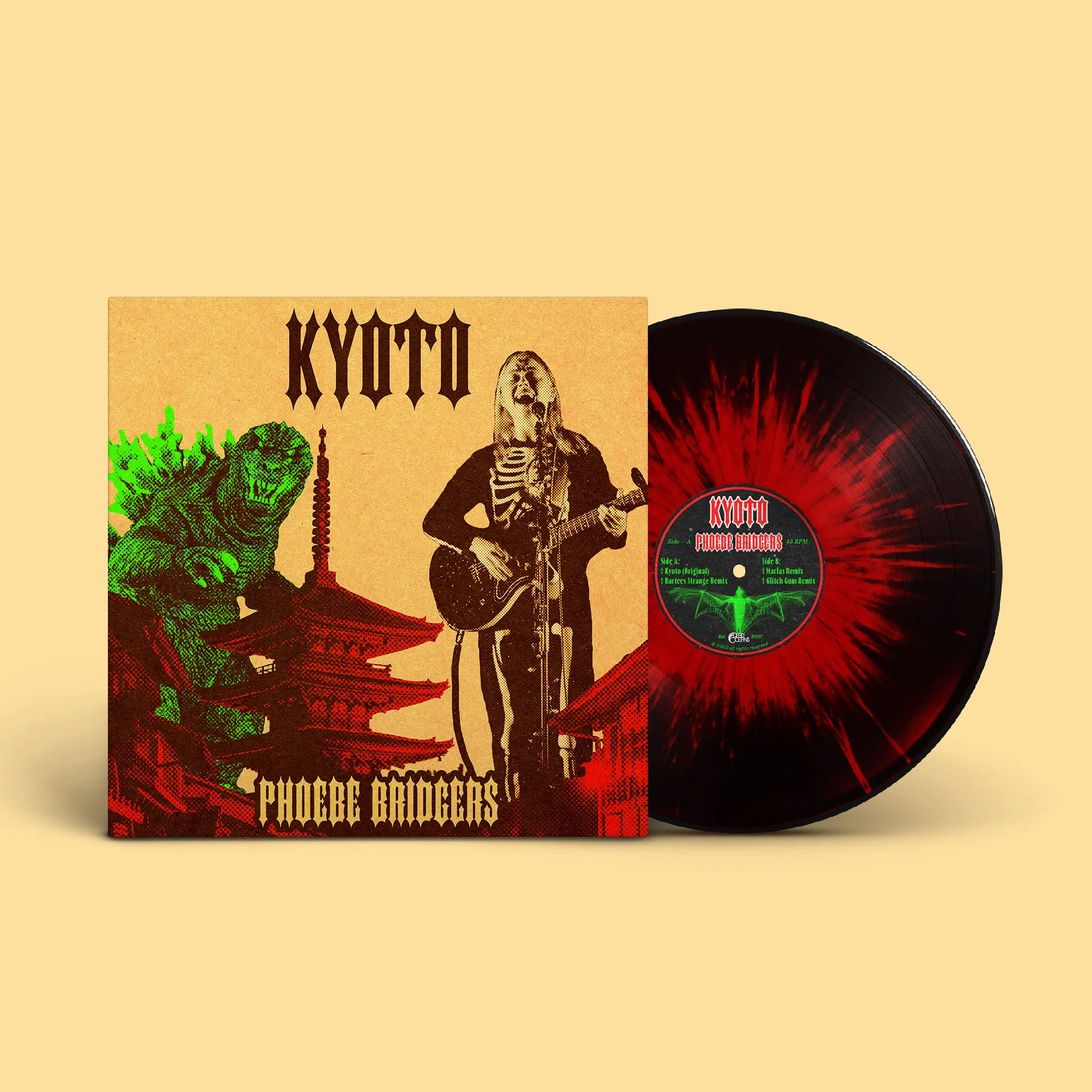 This concept came to me in a dream and I had to flesh it out. The Godzilla character is supposed to represent her dad, Phoebe, overcoming her relationship with her absent father, is taller than the monster. Of course, the historic temples of Kyoto in the foreground set the scene of an idyllic escape that is at the mercy of our antagonist and protagonist. The back of the record shows the calmness of the environment before Phoebe receives the call from her dad and the tranquility that comes from protecting one’s inner peace. I wanted the record itself to be blood-splatter to play off the metal aesthetics and an allegory of the slayed Godzilla. The bat skeleton is a nod to Phoebe’s love for skeletal outfits.