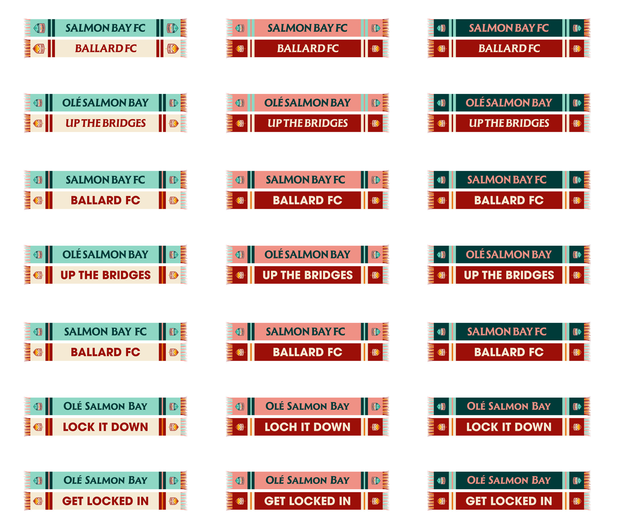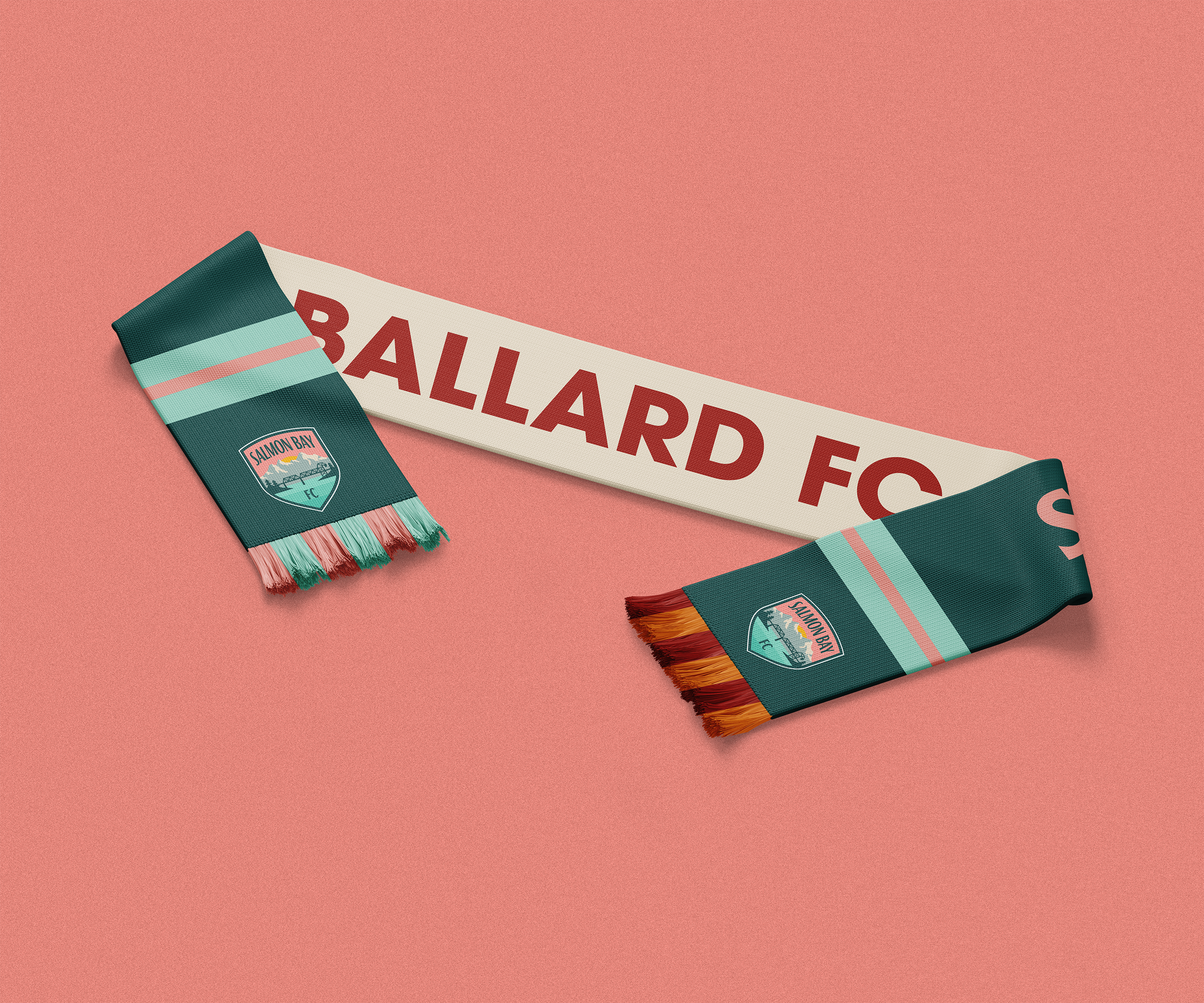 This year is the inaugural season of Salmon Bay FC, so to celebrate, the club decided to have fans design a two-sided scarf. As a soccer fanatic and designer I had to participate. My idea for the concept was to keep it simple and make it legible when held aloft by fellow fans at matches. I took inspiration from vintage English Premier League scarves as well as the local neighborhood’s fishing and Nordic roots.